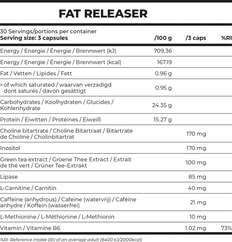 Fat Releaser assists healthy weight management, body metabolism & energy levels. It helps to use fats as an energy source during exercise. This supplement is of interest to athletes who want to reduce their fat percentage.