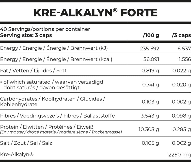Kre-alkalyn® Forte is the only creatine product in the world with a pH above 12 because its molecules are synthesized with “buffering” agents using a patented manufacturing process. As a result, it remains completely stable and reaches muscle cells at full strength. Creatine is generally considered the gold standard supplement for athletes and recreational lifters, based on its scientifically proven effects on strength, power and lean muscle tissue. Kre-alkalyn® Forte is a patented form of creatine that doesn’t require a load or cycle, and may have superior absorption to creatine monohydrate.