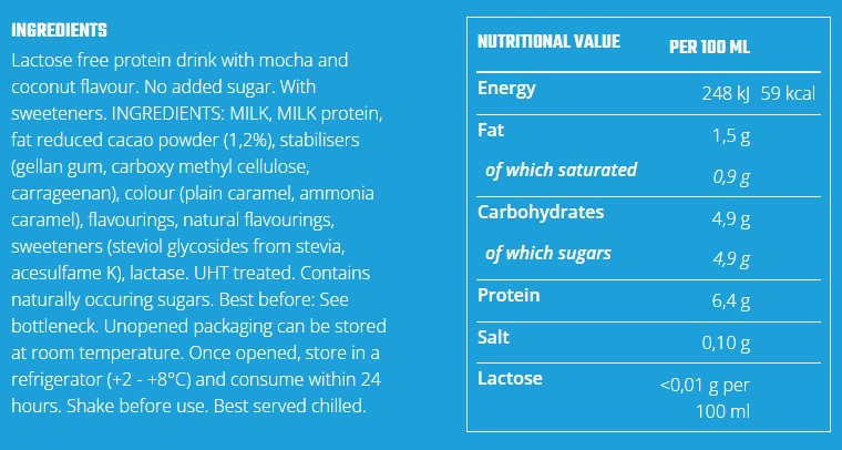 Perfectly sweet but without added sugars, lactose-free and rich in protein. Perfect to share with the whole family, for those who exercise more or just enjoy good taste. It fits perfectly before or after exercise for more energy and quick recovery. Tip! Serve cold and shake before use
